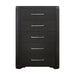 Elegant modern styling comprises the design of the Gilbert Collection while drawing subtle inspiration from the Art Deco movement. The oak veneer of the collection features a charcoal finish providing a rich hue to the distinct wood grain. Polished brass-tone bar pulls center each drawer of the chest for complementing contrast.